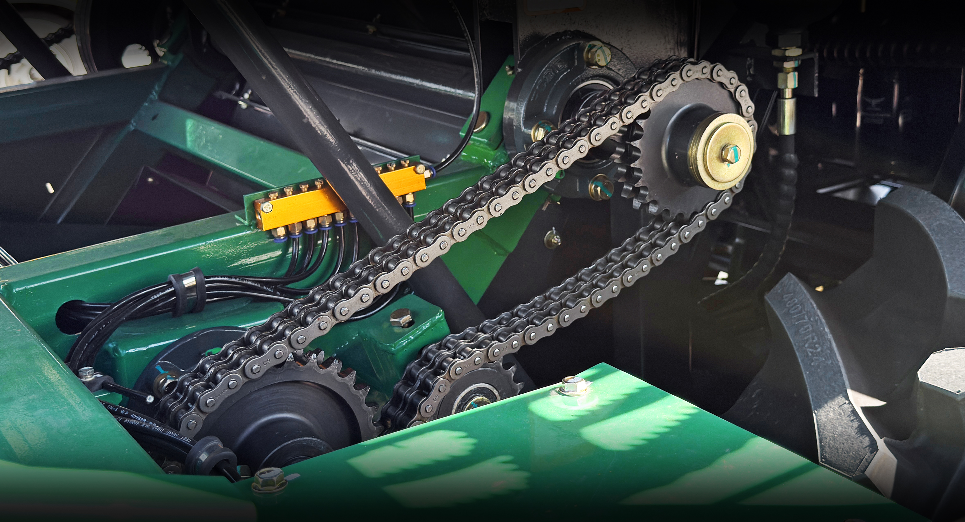 割台采用双侧16A链条传动,双边传动齿轮箱运转,割台运转更平稳。 拨禾链采用特殊高强度链条,配合大尺寸链轮,链条运转平稳,寿命长。